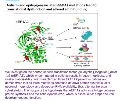 We investigated the neuron-specific translation factor, eukaryotic Elongation Factor 1a2 (eEF1A2), which when mutated in patients results in autism, epilepsy, and intellectual disability. We characterized three EEF1A2 patient mutations and demonstrate that all three mutations decrease de novo protein synthesis, alter neuronal morphology, and decrease tRNA availability, thus altering the actin cytoskeleton.